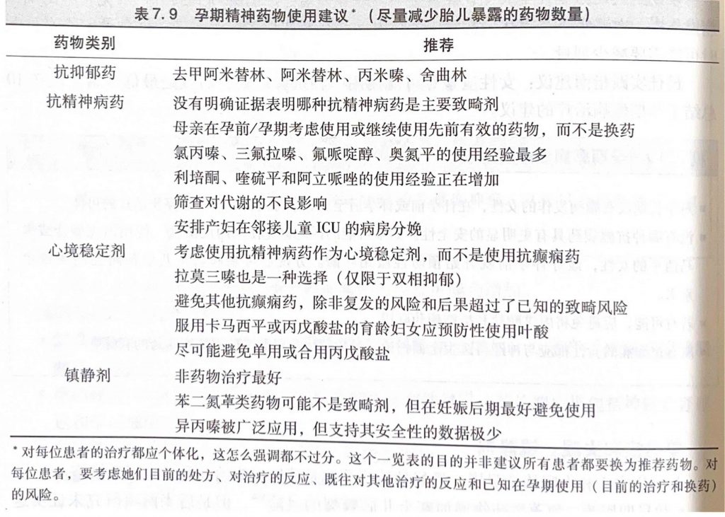 孕期精神病药物使用建议 2023-03-03临床用药、精神病学双相障碍、孕期用药、心境稳定剂、抗抑郁药、抗精神病药作者: 不想睡觉的星星 [英]David Taylor, 等. Maudsley精神科处方指南. 司天梅, 等, 译. 北京: 人民卫生出版社, 2017: 450.