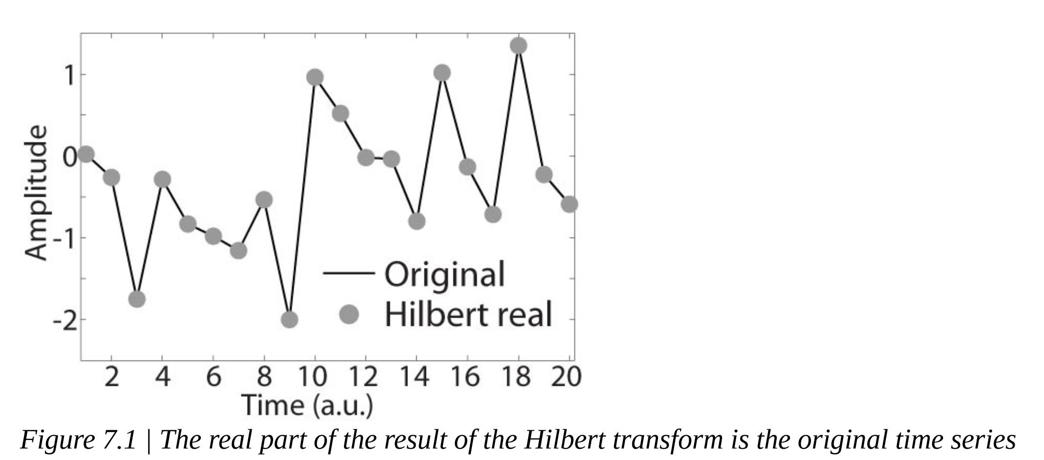 “The Matlab Signal Processing toolbox, and the Octave Signal package (free but not included with the typical Octave installation), contain a function called hilbert that will compute the Hilbert transform. You can also create your own function using the code above. The Hilbert transform does not affect the real part of a time series. This can be verified by plotting the real part of the Hilbert transform on top of the original time series.” (Mike X Fundamentals of Time-Frequency Analyses in Matlab/Octave, p. 96) Matlab信号处理工具箱和Octave Signal程序包(免费,但不包括typicall安装)包含一个希尔伯特函数来计算希尔伯特变换。也可以使用上面的代码创建自己的函数。希尔伯特变换不影响时间序列的实部。这可以通过在原始时间序列上绘制希尔伯特变换的实部来验证。